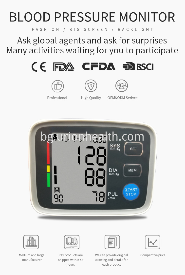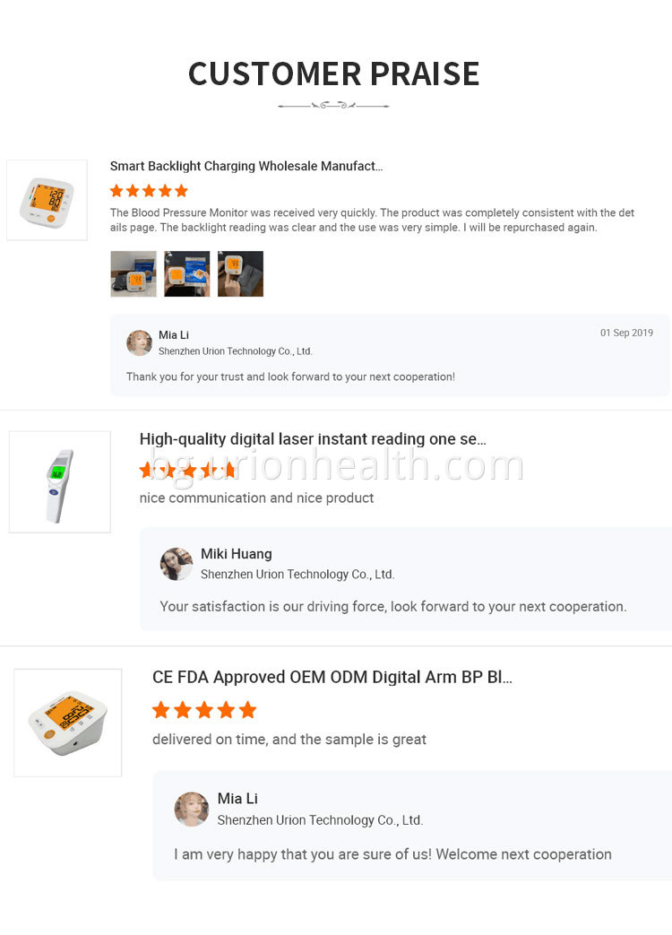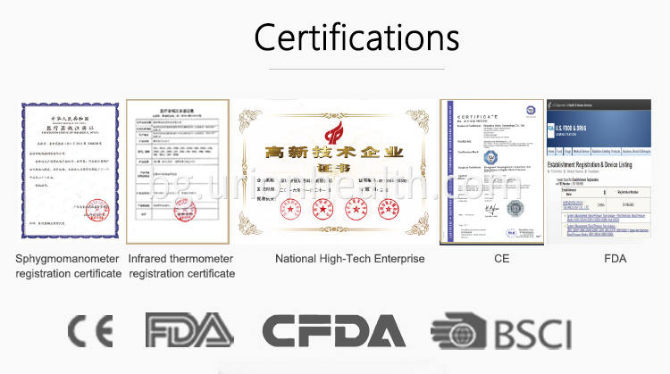 A1: Да, ние сме професионален производител на домашни медицински изделия и национално високотехнологично предприятие . Нашата компания е създадена през 2011 г. и е специализирана в цифрови апарати за измерване на кръвно налягане, инфрачервен термометър, пулверизатор и свързаните с тях Bluetooth, Wi-Fi интелигентни домашни медицински устройства за повече от 8 години. Нашата компания се намира в град Шенжен, Гуандун. Винаги сте добре дошли да ни посетите.